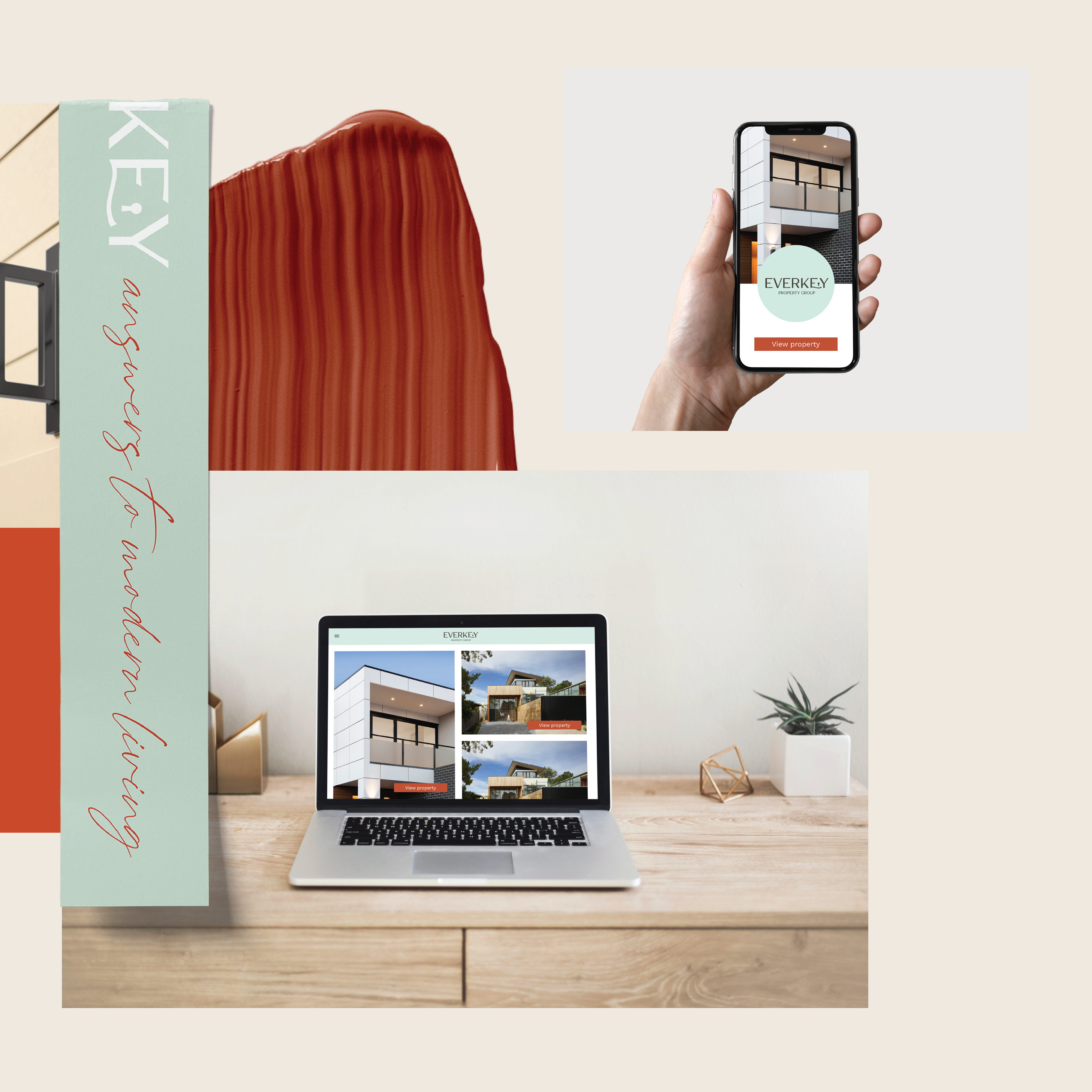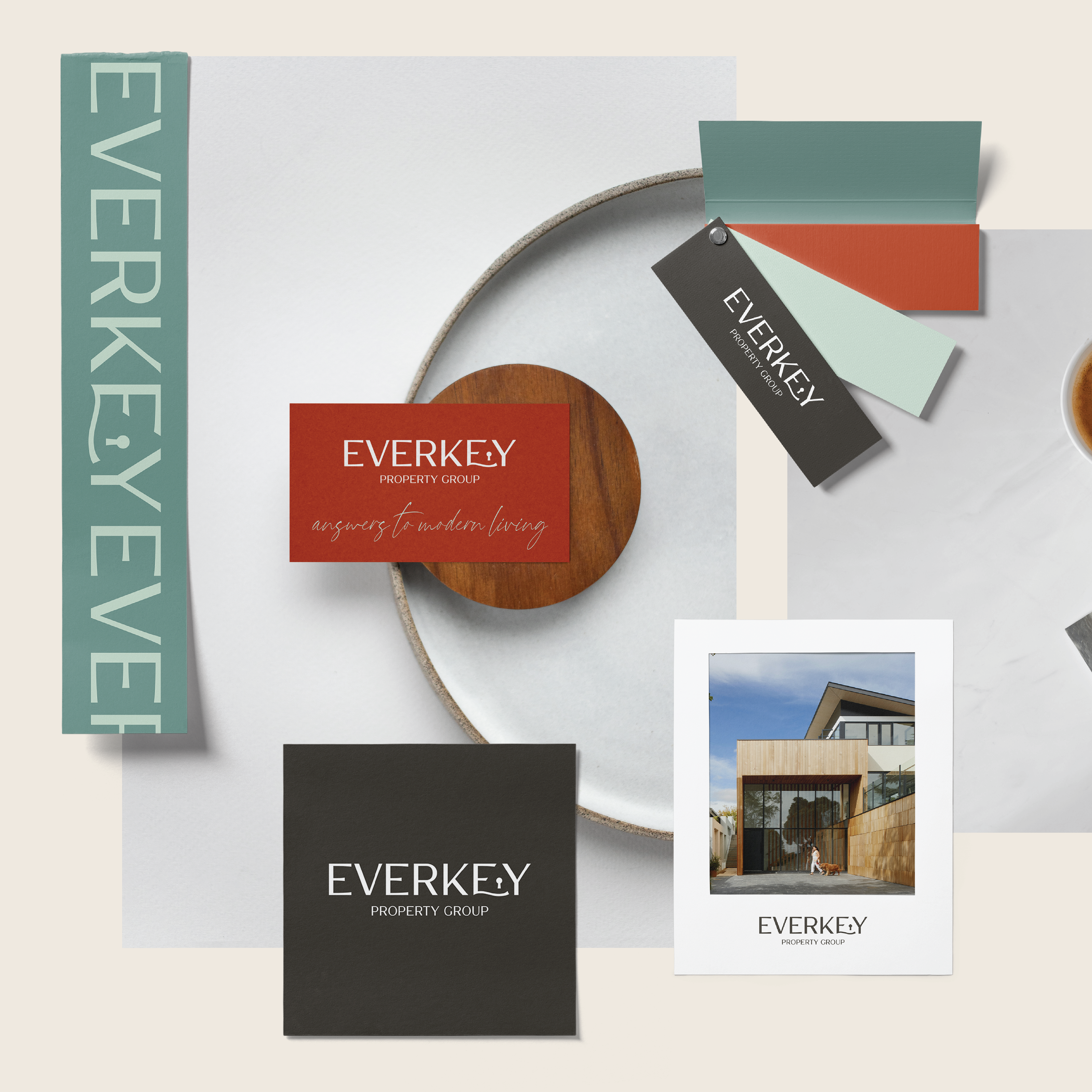 Logo design for UK property group Everkey. Elegant and modern design and colours support carefully selected imagery and composition.