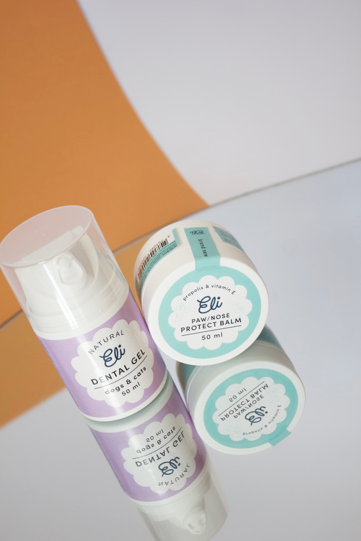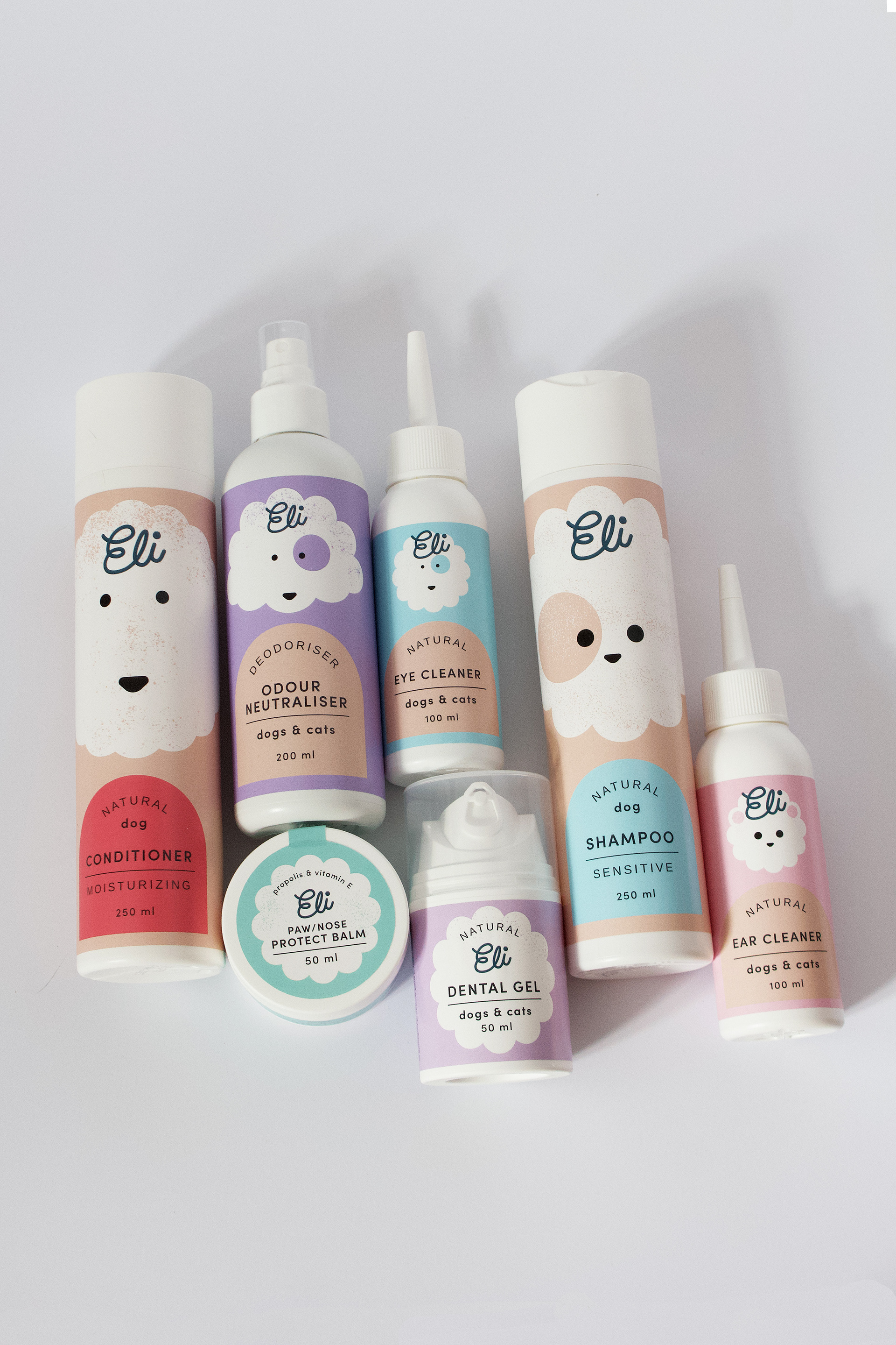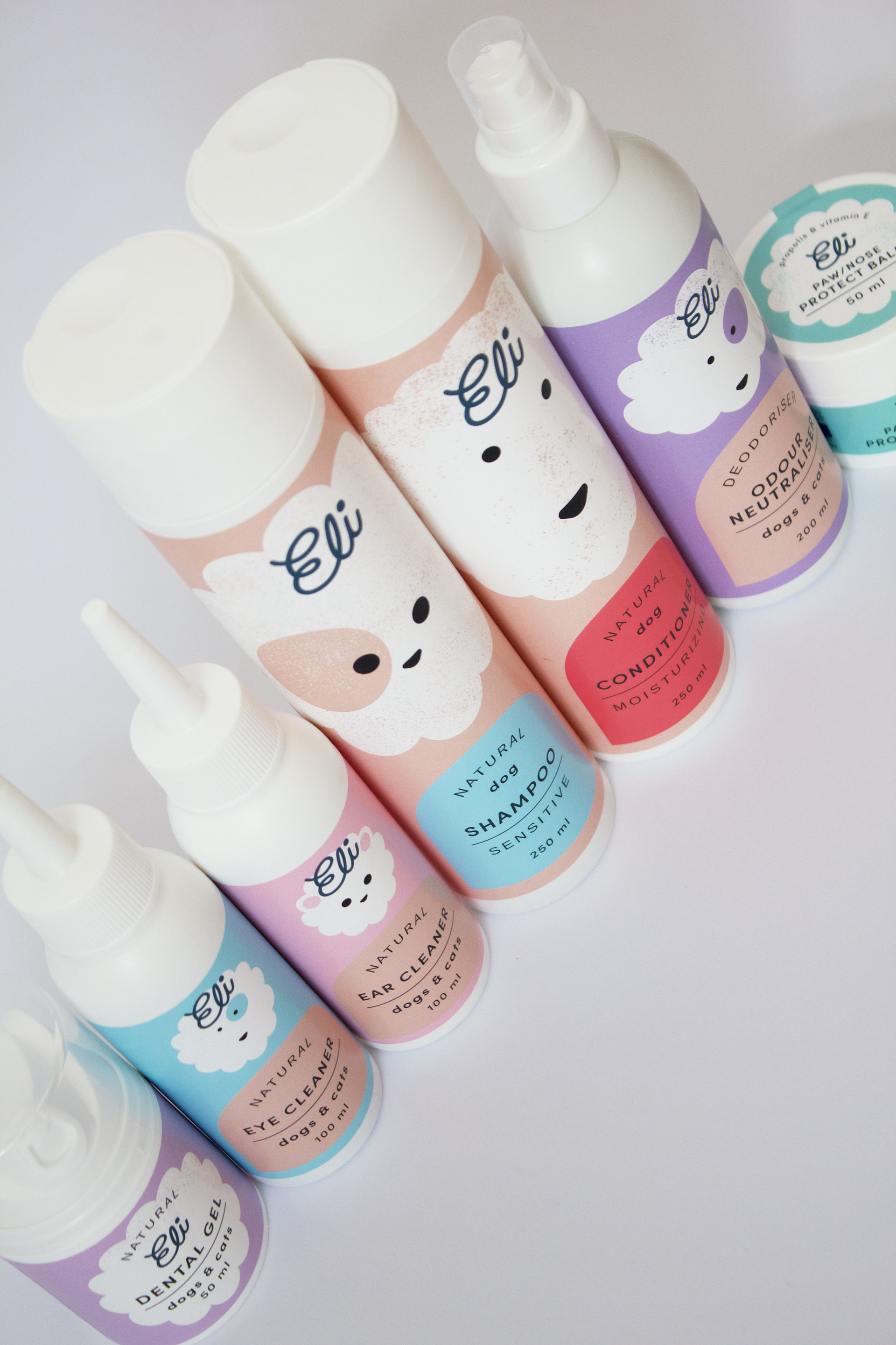 Packaging design for brand new products released by Eli pets brand. Friendly round shapes and pastel colours, playful dog portraits with light grain textures. Looks great individually and as a set, making pet grooming more fun and enjoyable!